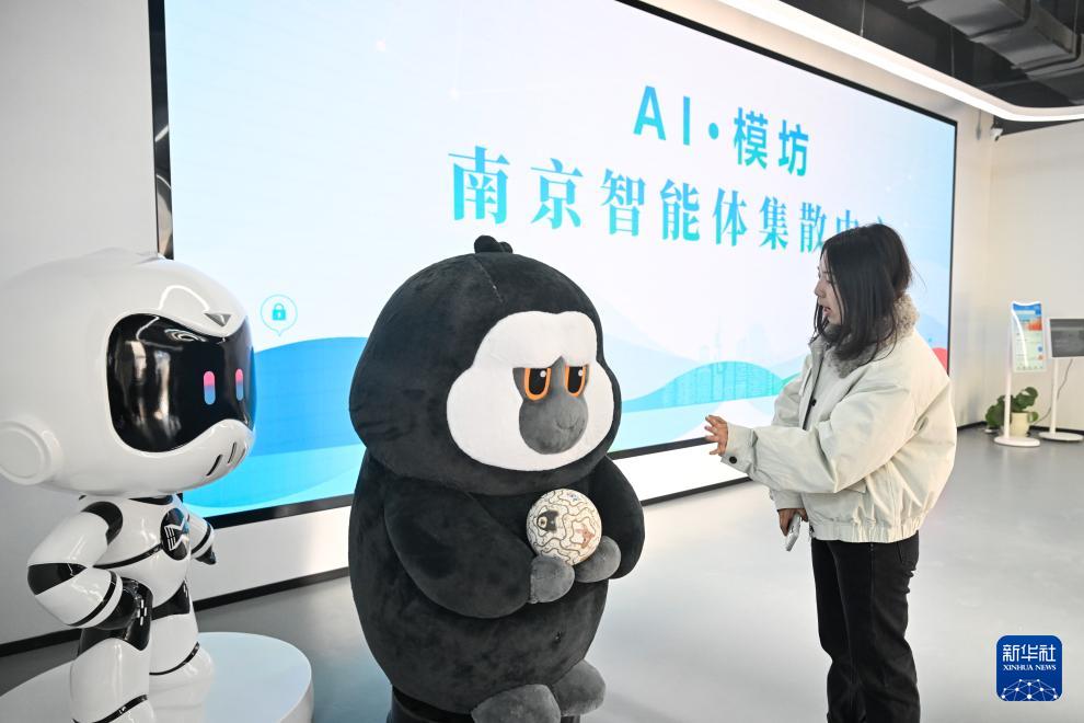 12月4日,在南京人工智能生態街區的“AI·模坊”南京智能體集散中心,一位女士與機器人互動。