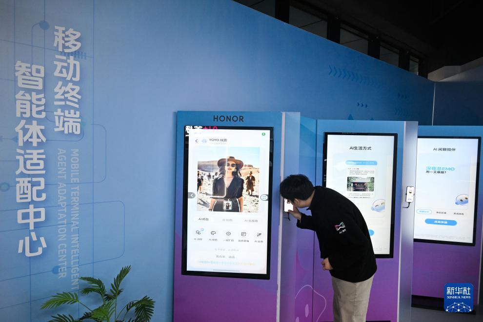 12月4日,在南京人工智能生態街區的“AI·模坊”南京智能體集散中心,工作人員與智能移動終端互動。