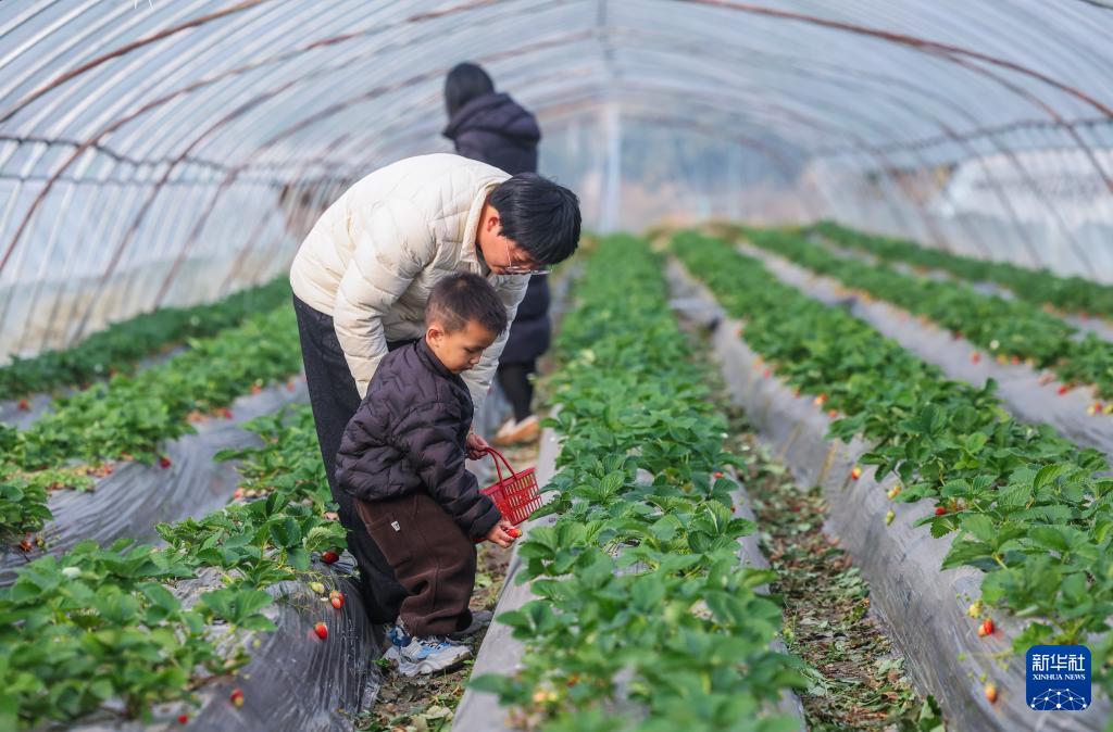 12月4日,游客在長(zhǎng)興縣和平鎮(zhèn)便民橋村蜜甜家庭農(nóng)場(chǎng)大棚內(nèi)采摘草莓。