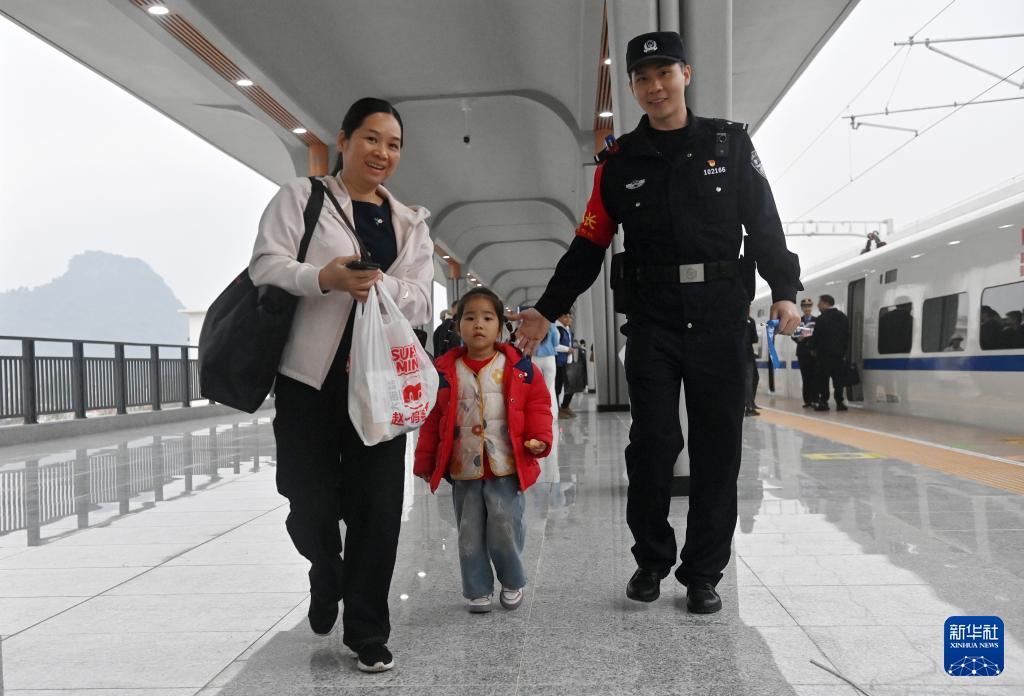 12月5日,工作人員在憑祥東站引導旅客上車。
