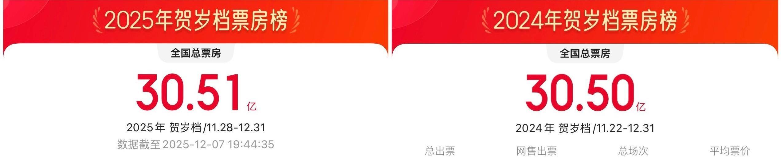 據網絡平臺數據,截至12月7日19時44分,2025賀歲檔(11月28日—12月31日)票房突破30.51億,超2024年賀歲檔票房成績。