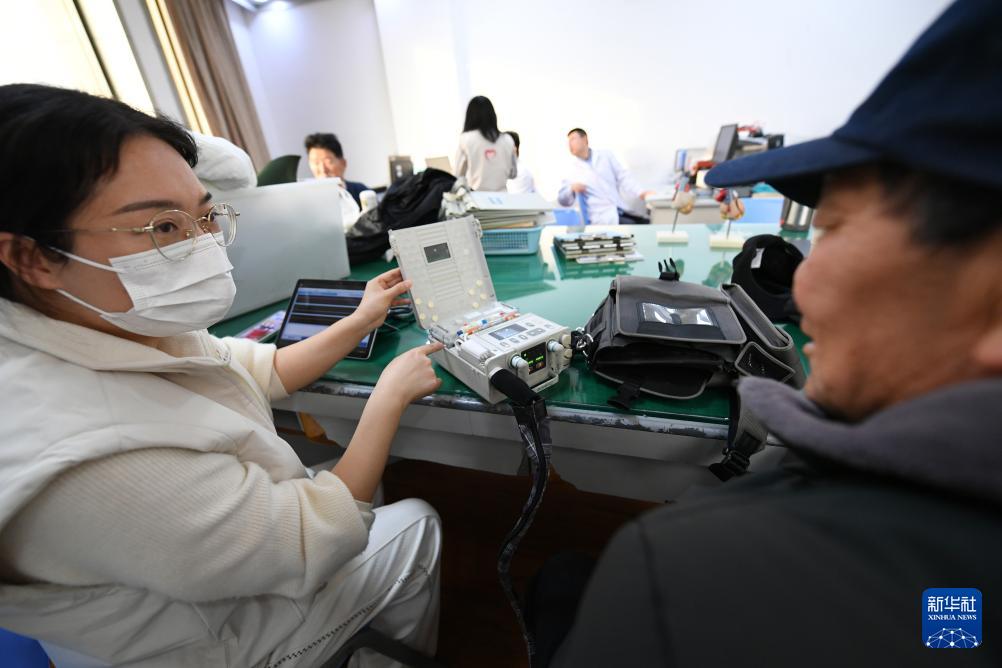 12月7日,技術人員(左)為人工心臟植入手術康復者講解人工心臟電池控制設備使用注意事項。