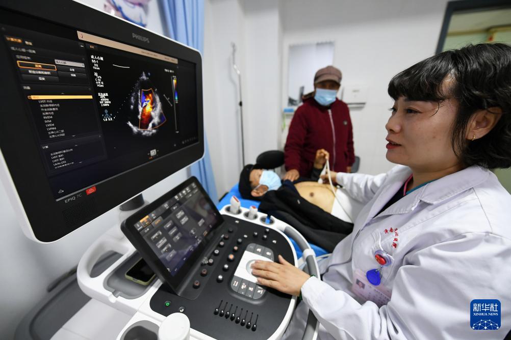 12月7日,濟南市中心醫院醫務人員為人工心臟植入手術康復者復診。