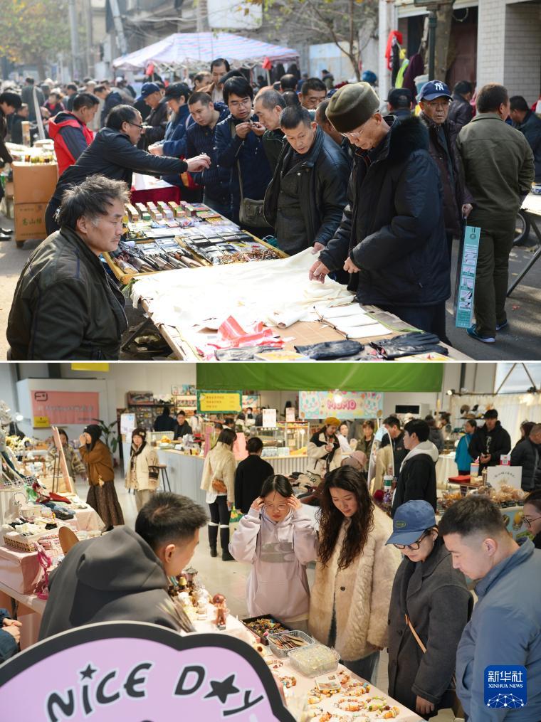 拼版照片:上圖為游客在位于西安市蓮湖區的老西倉市集上選購商品(2016年12月1日攝);下圖為游客在改造后的西安西倉市集文創公園一處市集上選購商品(2025年12月6日攝)。