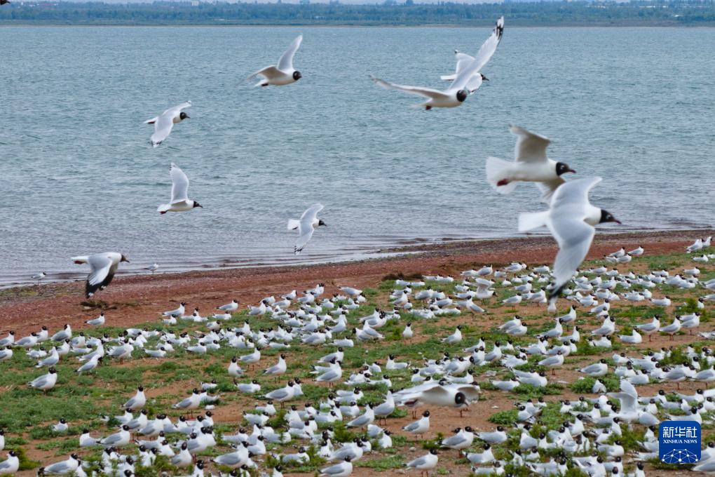 紅堿淖國家級自然保護區湖心島上的遺鷗(2024年6月4日攝,無人機照片)。