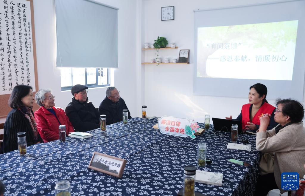 12月11日,在浙江省嘉興市南湖區電子社區“有間茶館”內,社區黨員志愿者(右二)聽取關于社區事務的意見和建議。