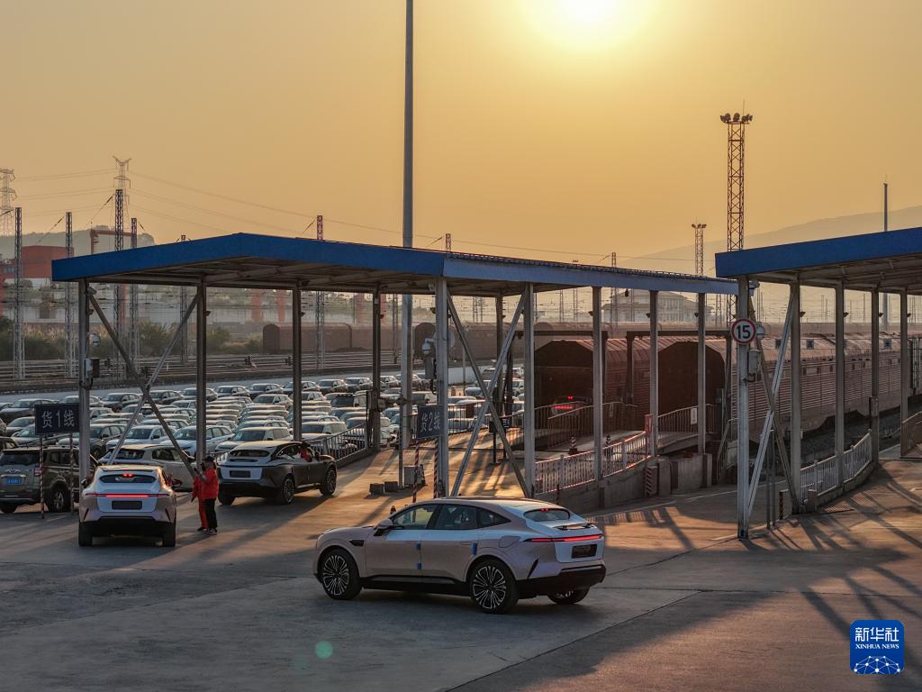 11月29日,在重慶果園港國家物流樞紐鐵路貨運魚嘴站商品車物流基地,“重慶造”新能源汽車排隊駛入“渝車”專列。