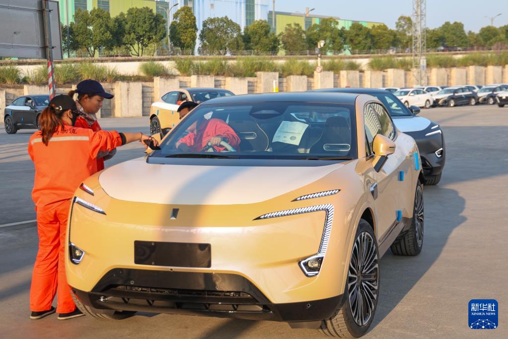 11月29日,在重慶果園港國家物流樞紐鐵路貨運魚嘴站商品車物流基地,工作人員在登記即將登上“專列”的“重慶造”新能源汽車。