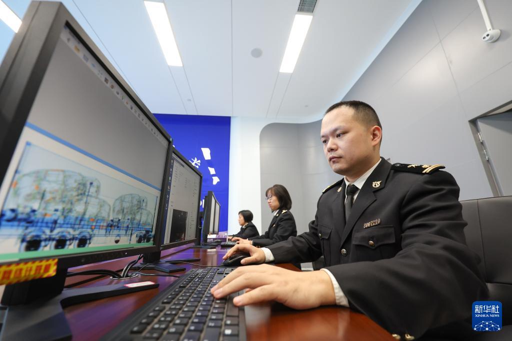 12月4日,重慶海關所屬重慶港海關關員在集中審像中心審看即將出口的新能源汽車圖像。
