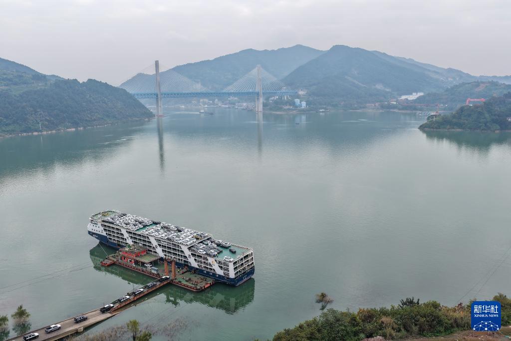 12月5日,在重慶果園港滾裝碼頭,“重慶造”新能源汽車在裝船,之后將通過“江海聯運”的方式出海(無人機照片)。
