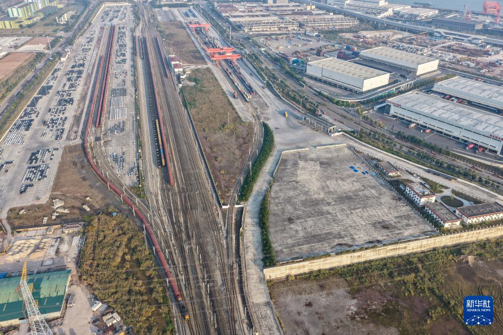 11月29日,一列滿載“重慶造”新能源汽車的貨運專列駛出重慶果園港國家物流樞紐鐵路貨運魚嘴站商品車物流基地(無人機照片)。