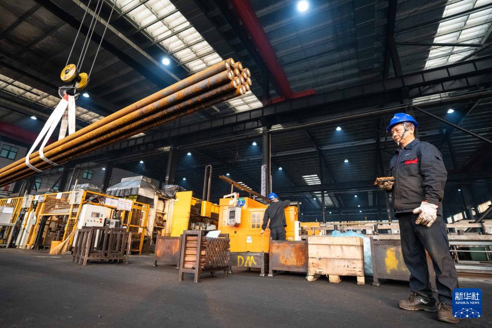 12月11日,在位于桃源縣陬市鎮觀音橋村的湖南飛沃新能源科技股份有限公司生產車間,工人在吊運制作風機葉片緊固件產品的原材料。