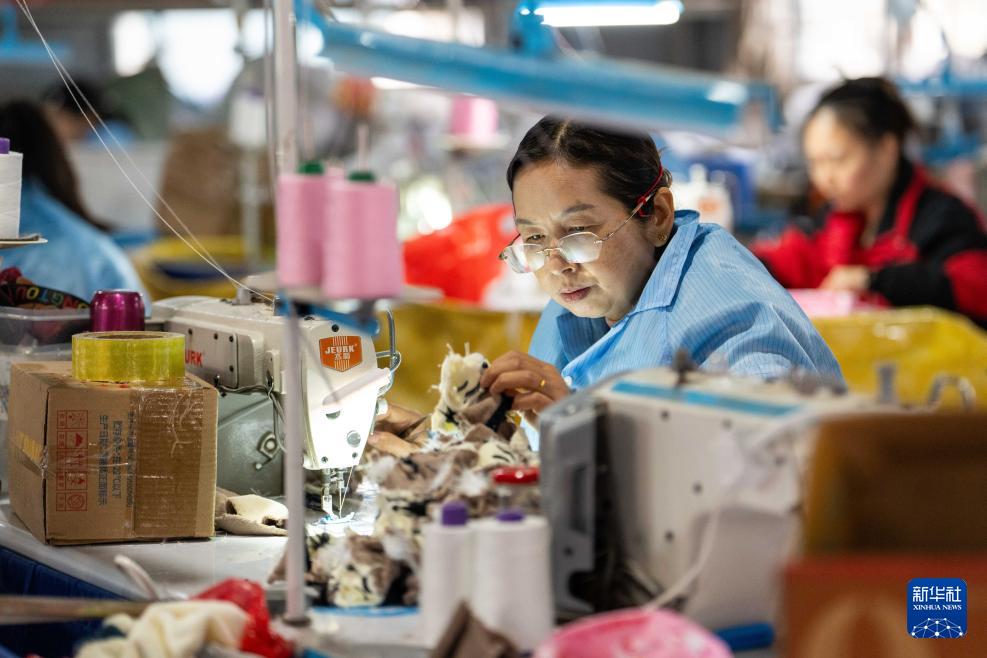 12月11日,在位于桃源縣青林回族維吾爾族鄉督糧沖村的常德市雙閱玩具有限公司鄉村車間,工人在制作布藝玩具。