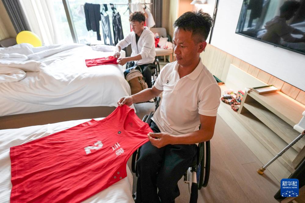 12月12日,西藏輪椅籃球隊球員旦增(右)和隊友在運動員酒店房間內整理隊服。