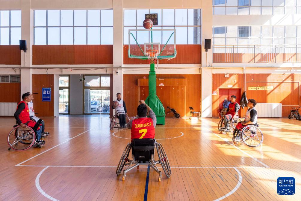 11月30日,西藏輪椅籃球隊球員強巴次仁(中)在拉薩的訓練場投籃。