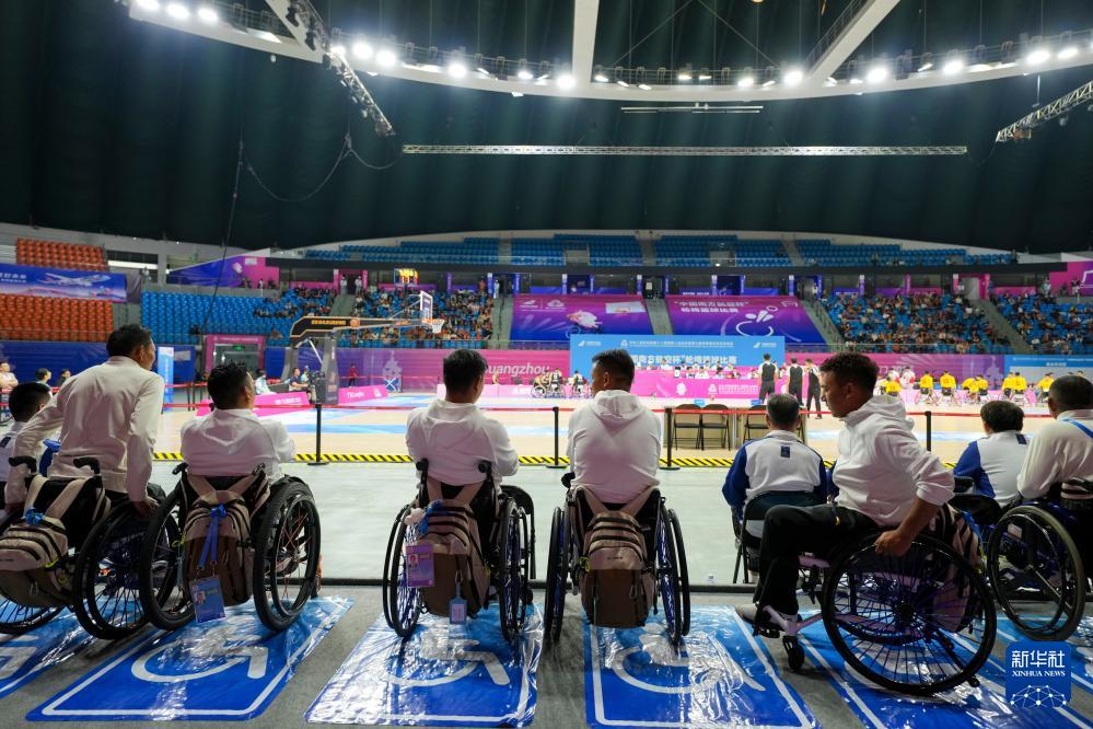 12月12日,西藏輪椅籃球隊球員在廣州體育館內(nèi)專設(shè)的輪椅運動員區(qū)觀看比賽。