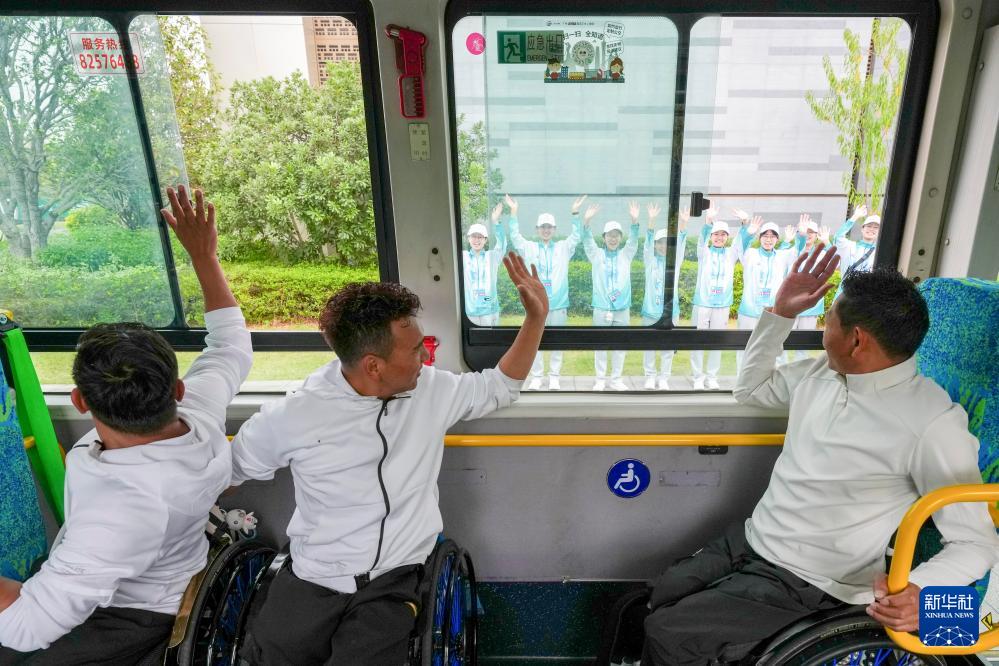 12月12日,西藏輪椅籃球隊球員次旺仁增(左)、加央江村(中)、旦增赤列在無障礙巴士上向志愿者揮手。