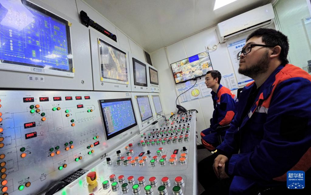 12月16日,工人在“領(lǐng)航號”盾構(gòu)機(jī)控制室內(nèi)監(jiān)看掘進(jìn)運行數(shù)據(jù)。