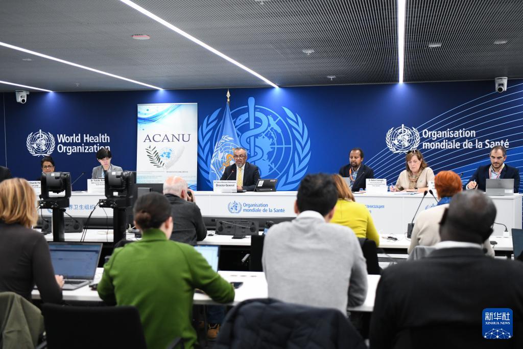 12月11日,世界衛(wèi)生組織總干事譚德塞(中)在瑞士日內瓦舉行的新聞發(fā)布會上講話。