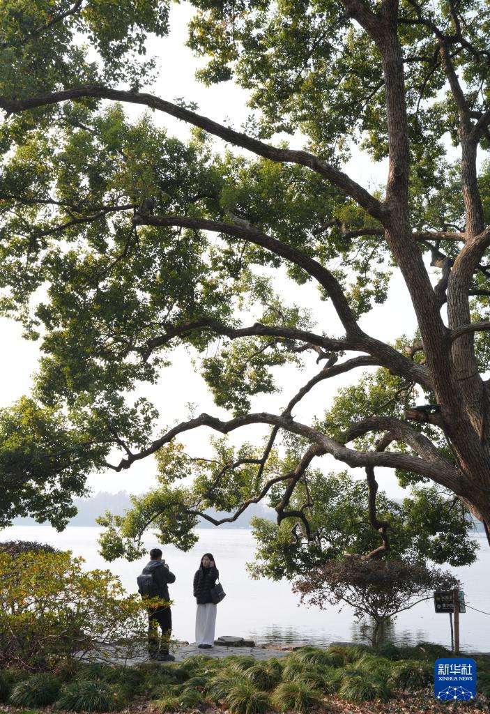 游客在杭州蘇堤上的香樟樹下留影(12月17日攝)。