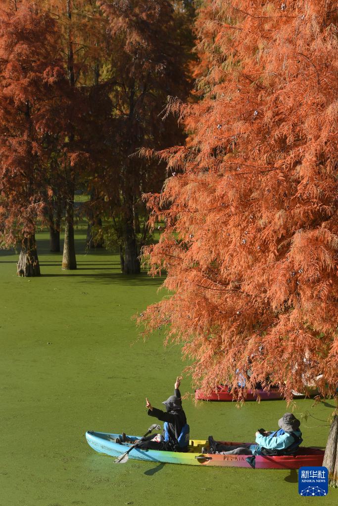 游客在杭州青山湖的杉樹間泛舟(11月28日攝)。
