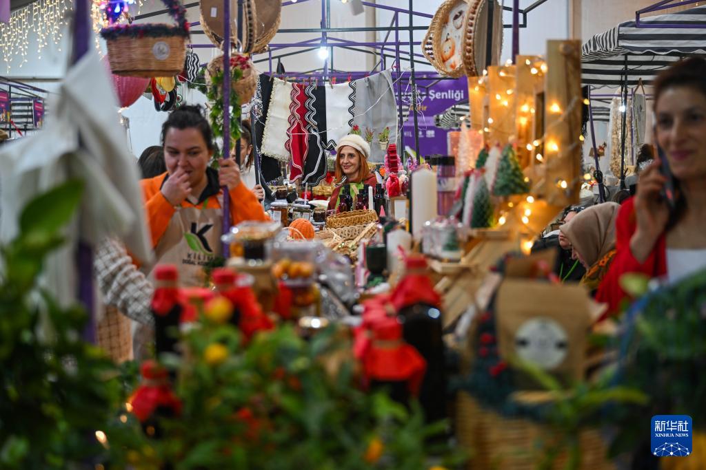 隨著新年臨近,土耳其伊斯坦布爾加拉塔港的鐘樓廣場搭建好帳篷舉辦新年購物節,售賣與節日相關的商品。