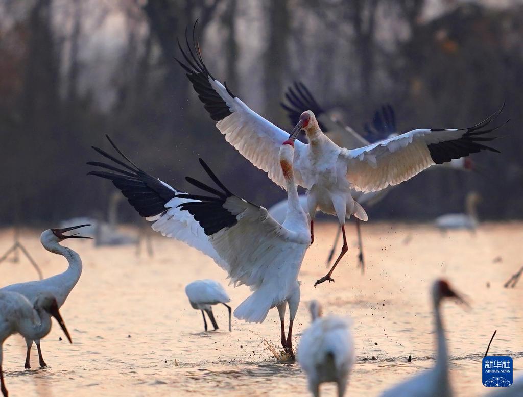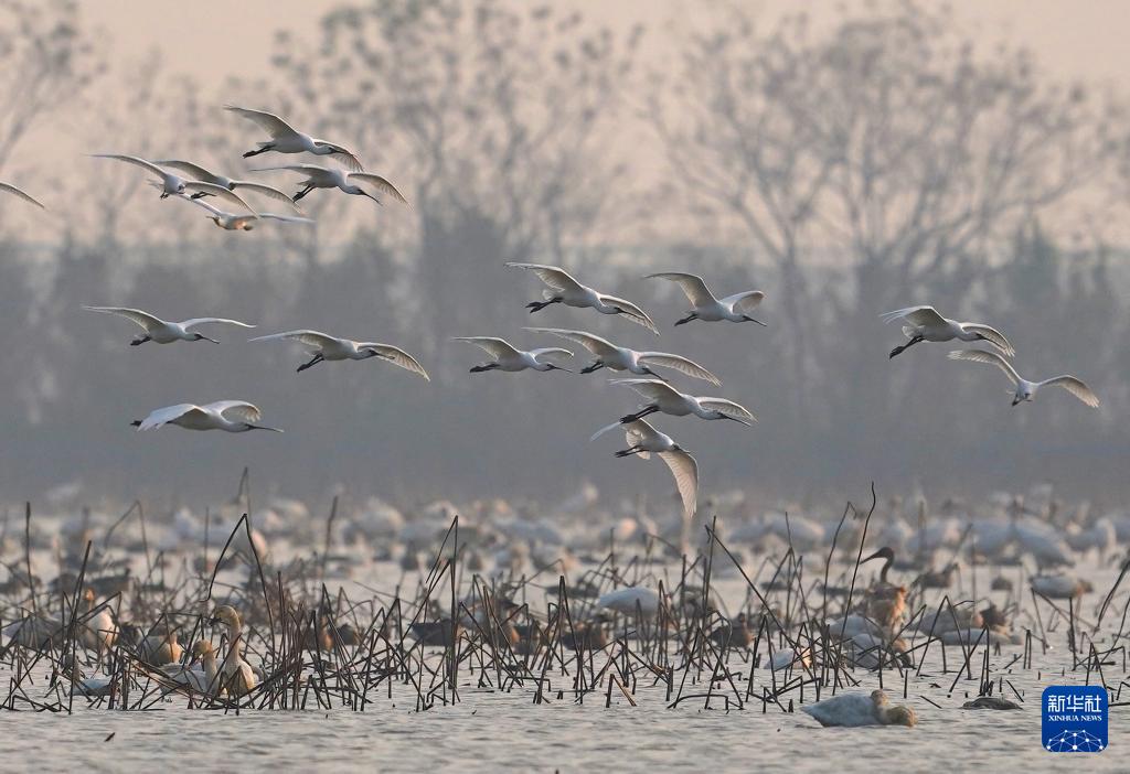 白琵鷺等候鳥(niǎo)在南昌五星白鶴保護(hù)小區(qū)內(nèi)棲息飛翔(12月17日攝)。
