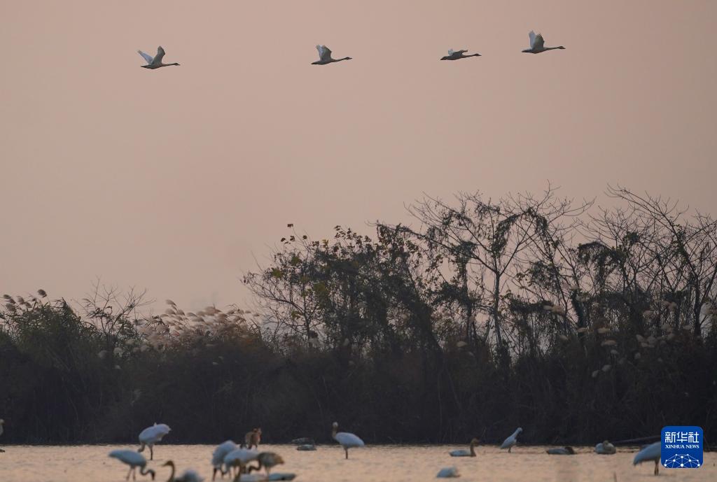 天鵝等候鳥(niǎo)在南昌五星白鶴保護(hù)小區(qū)內(nèi)棲息飛翔(12月17日攝)。