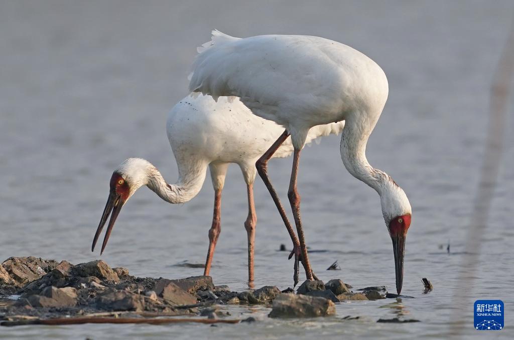 兩只白鶴在南昌五星白鶴保護(hù)小區(qū)內(nèi)棲息覓食(12月17日攝)。