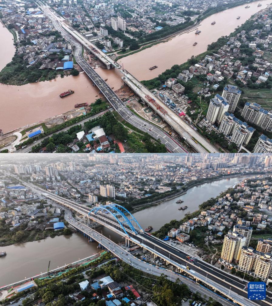 拼版照片:上圖是2024年4月25日拍攝的欽州三橋(無人機照片);下圖是2025年12月17日拍攝的欽州三橋(無人機照片)。