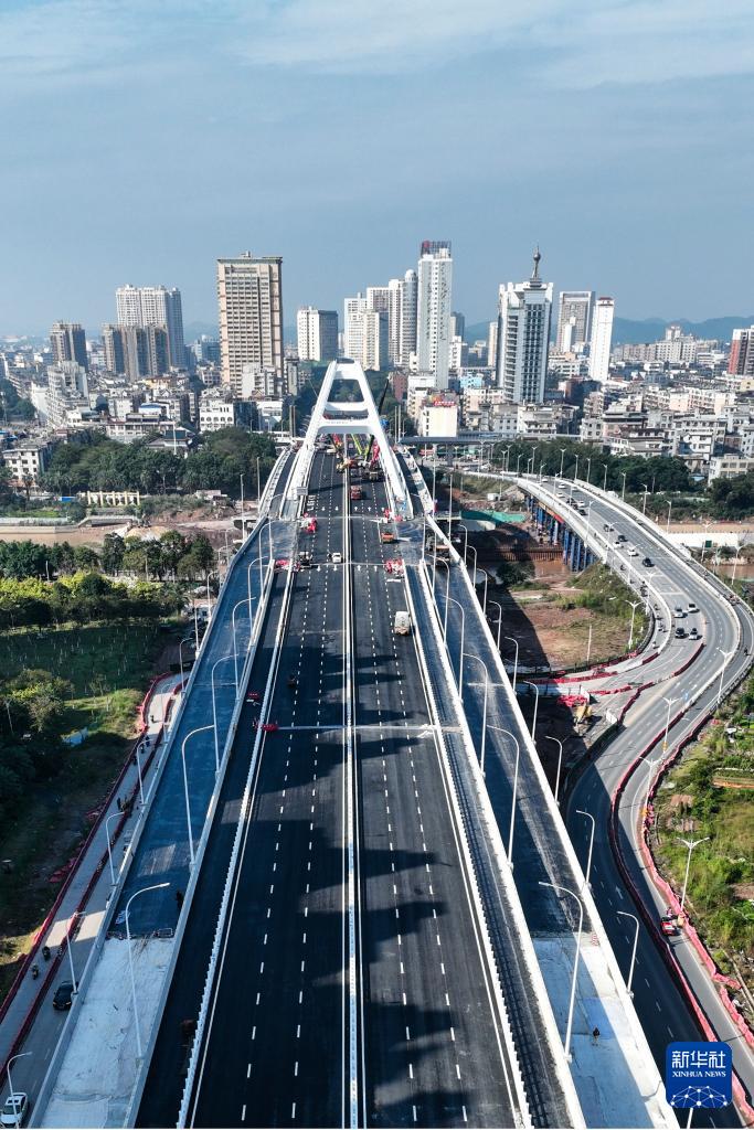 這是重建后的欽江二橋,施工隊(duì)正在鋪設(shè)路面(12月17日攝,無(wú)人機(jī)照片)。