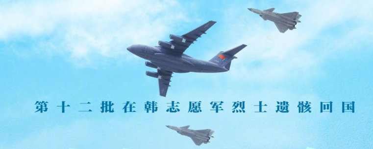 新華社快訊:12日上午,赴韓接運第十二批在韓中國人民志愿軍烈士遺骸回國的運-20飛機已進入我國領空,空軍4架殲-20飛機伴飛護航